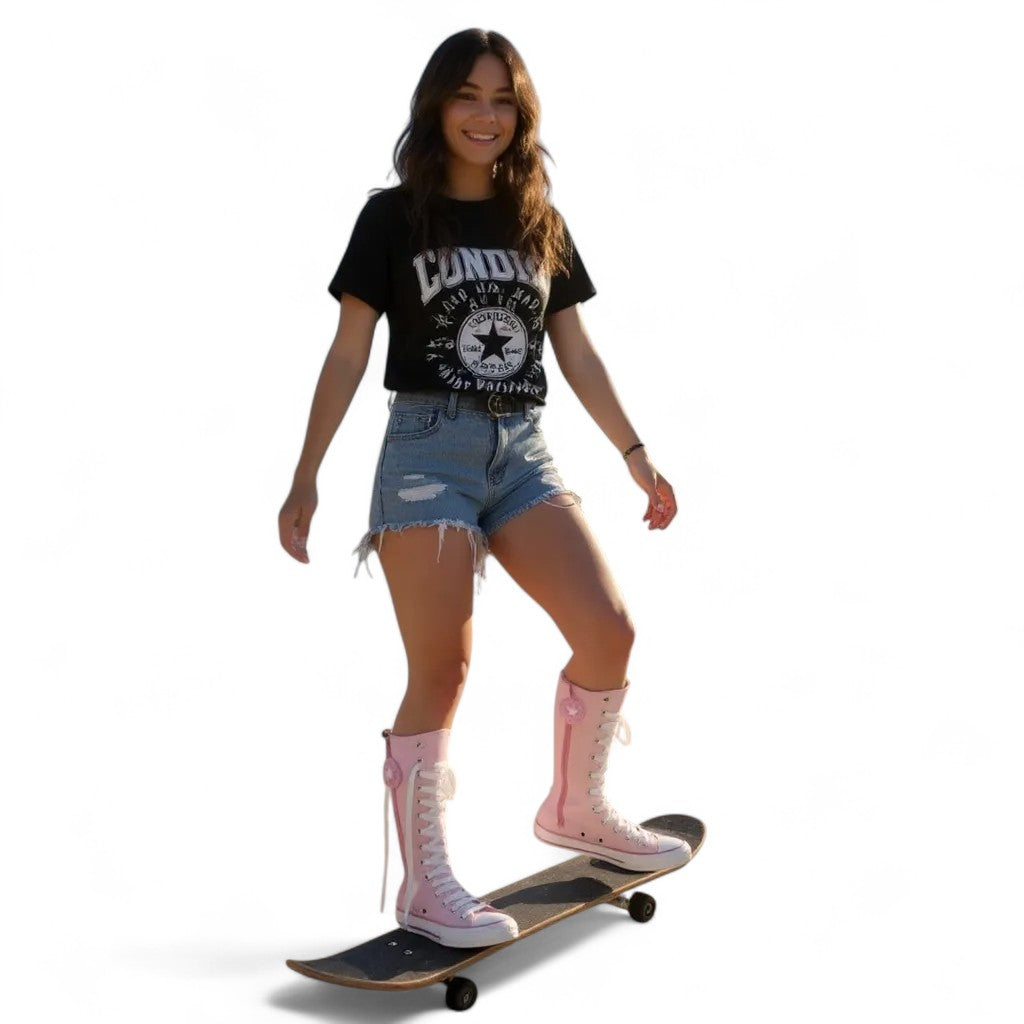 Converse Chuck Taylor All Star bota hasta la rodilla: caña alta para un estilo audaz, lona clásica y patrón deslavado en dos tonos que añade un toque divertido y femenino. Cordones blancos a lo largo de la caña, cremallera interior para un calce fácil, parche clásico en el tobillo y placa All Star en la suela trasera. Perfectas para destacar en cualquier look urbano.