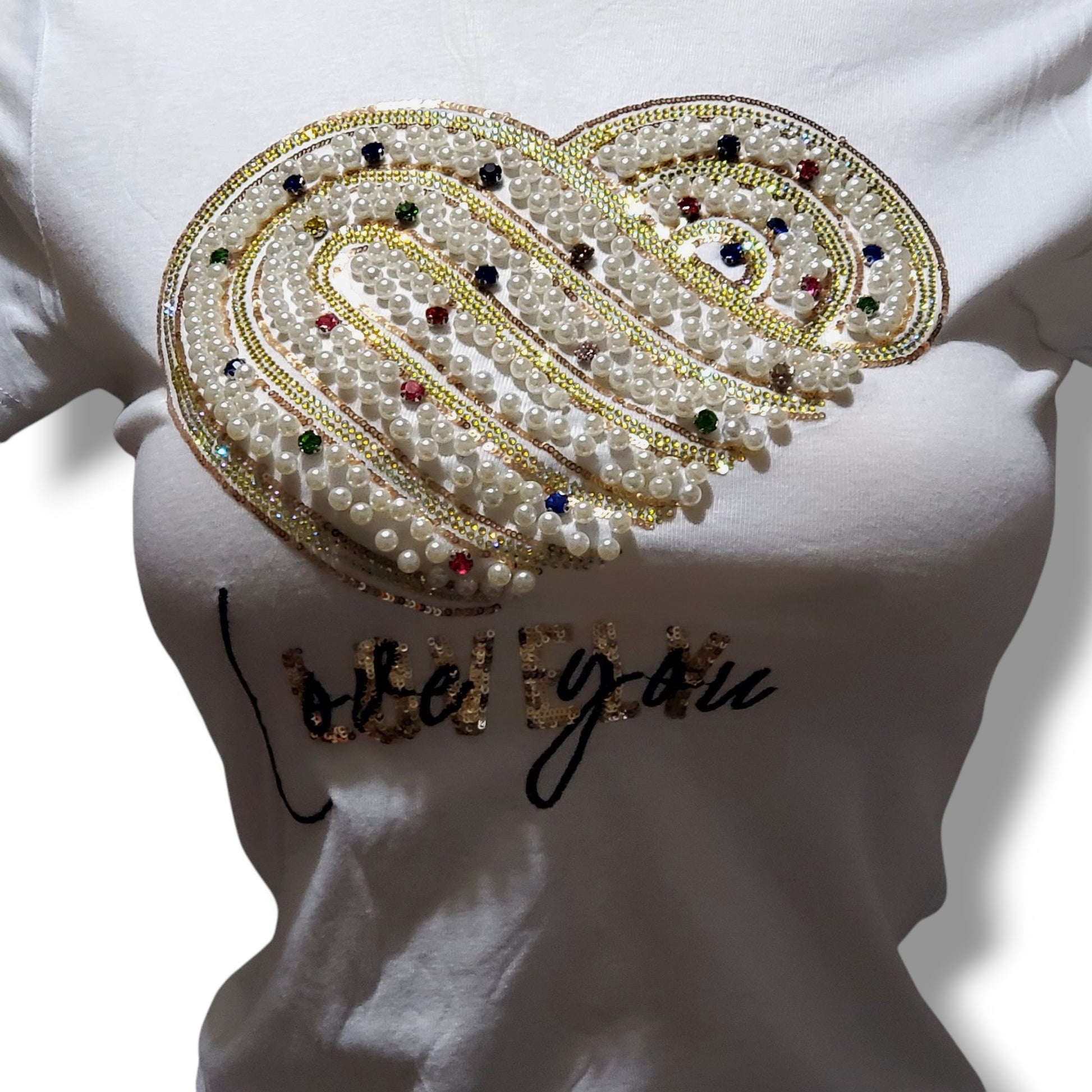 Camisa de cuello redondo con corazón decorado de perlas y gemas multicolor. Juvenil y llamativa.