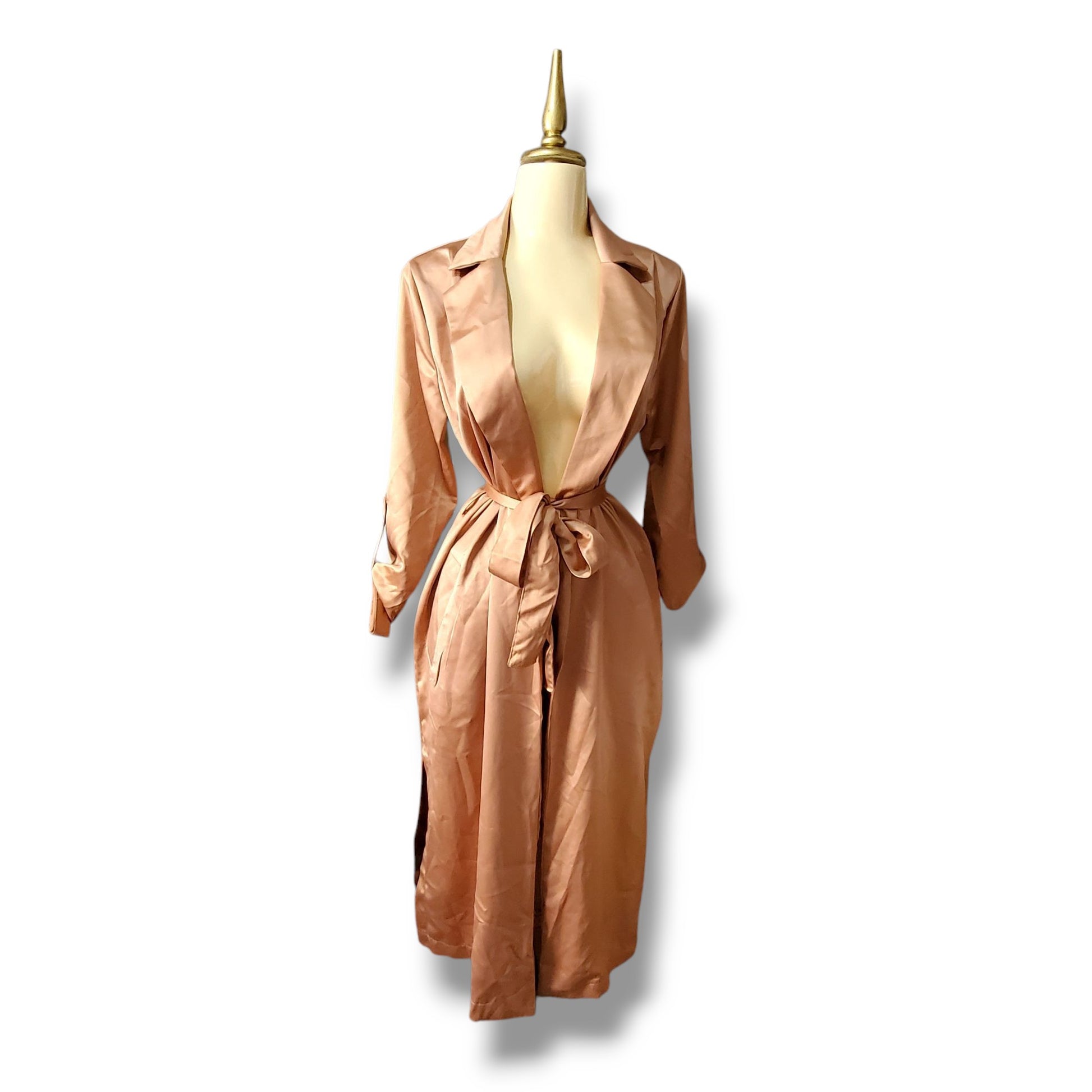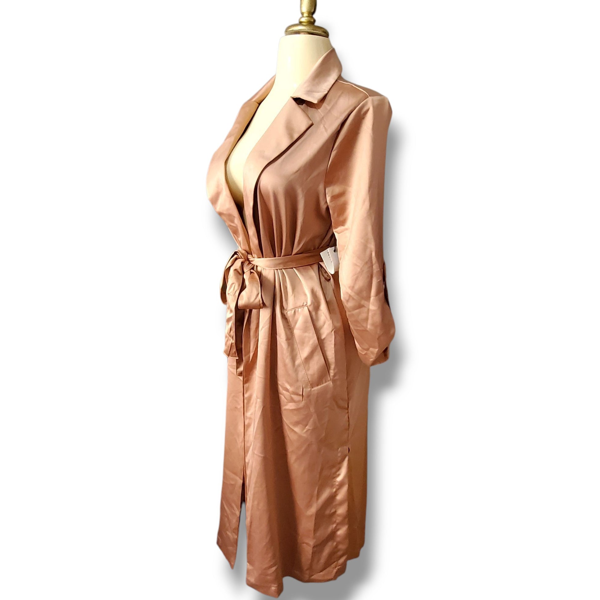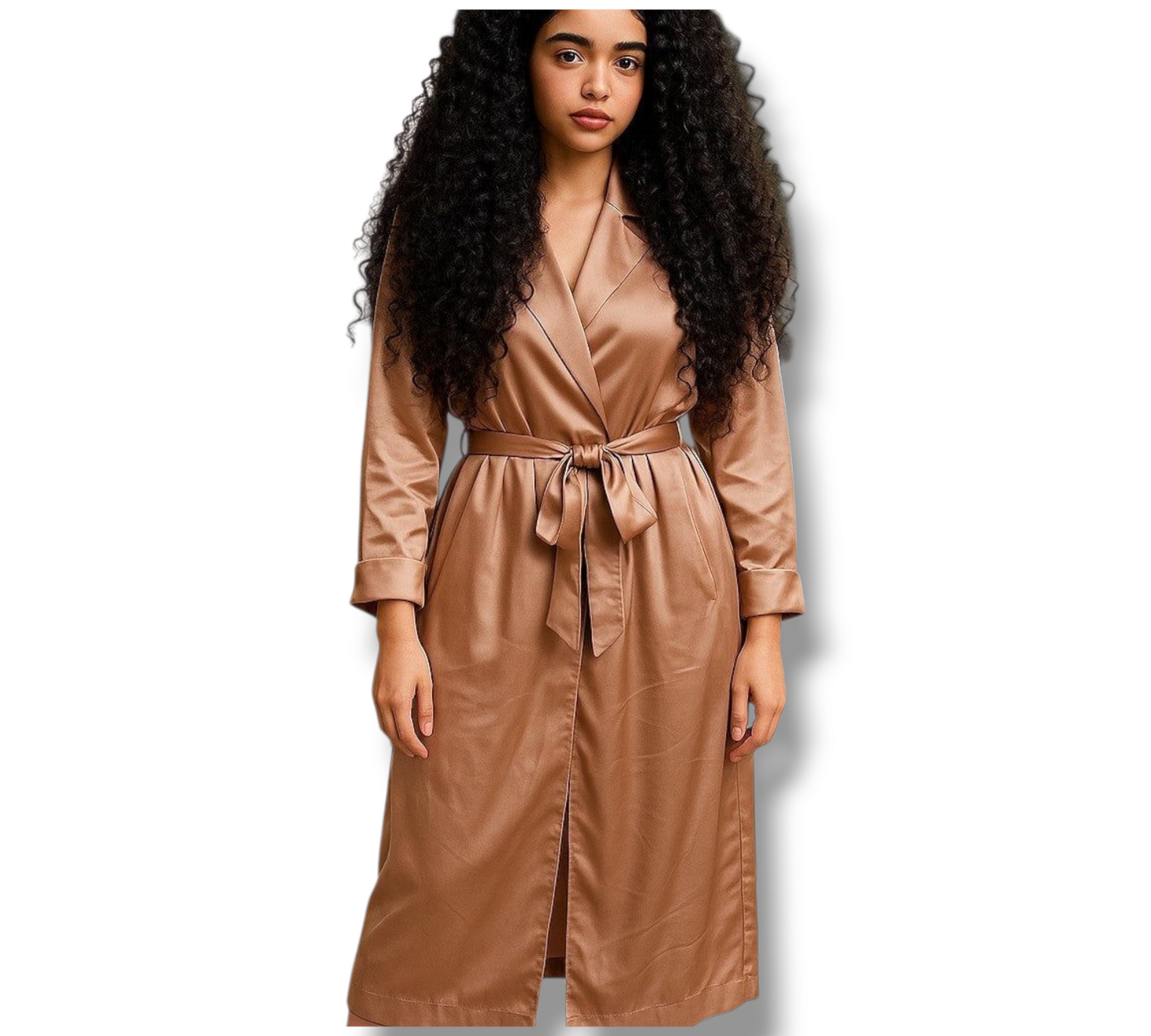 Abrigo largo satinado con cinturón – Cuello de solapa y mangas ajustables
