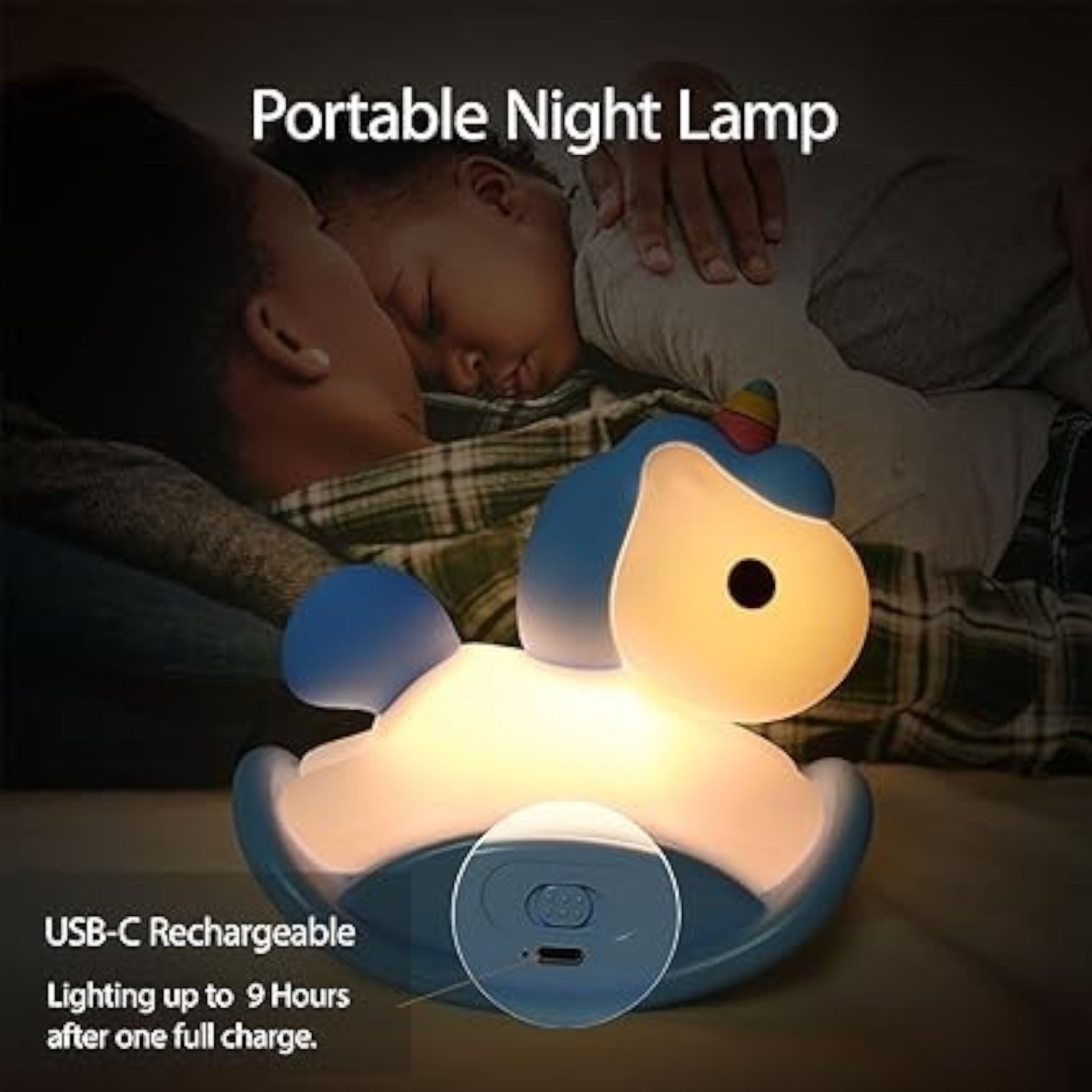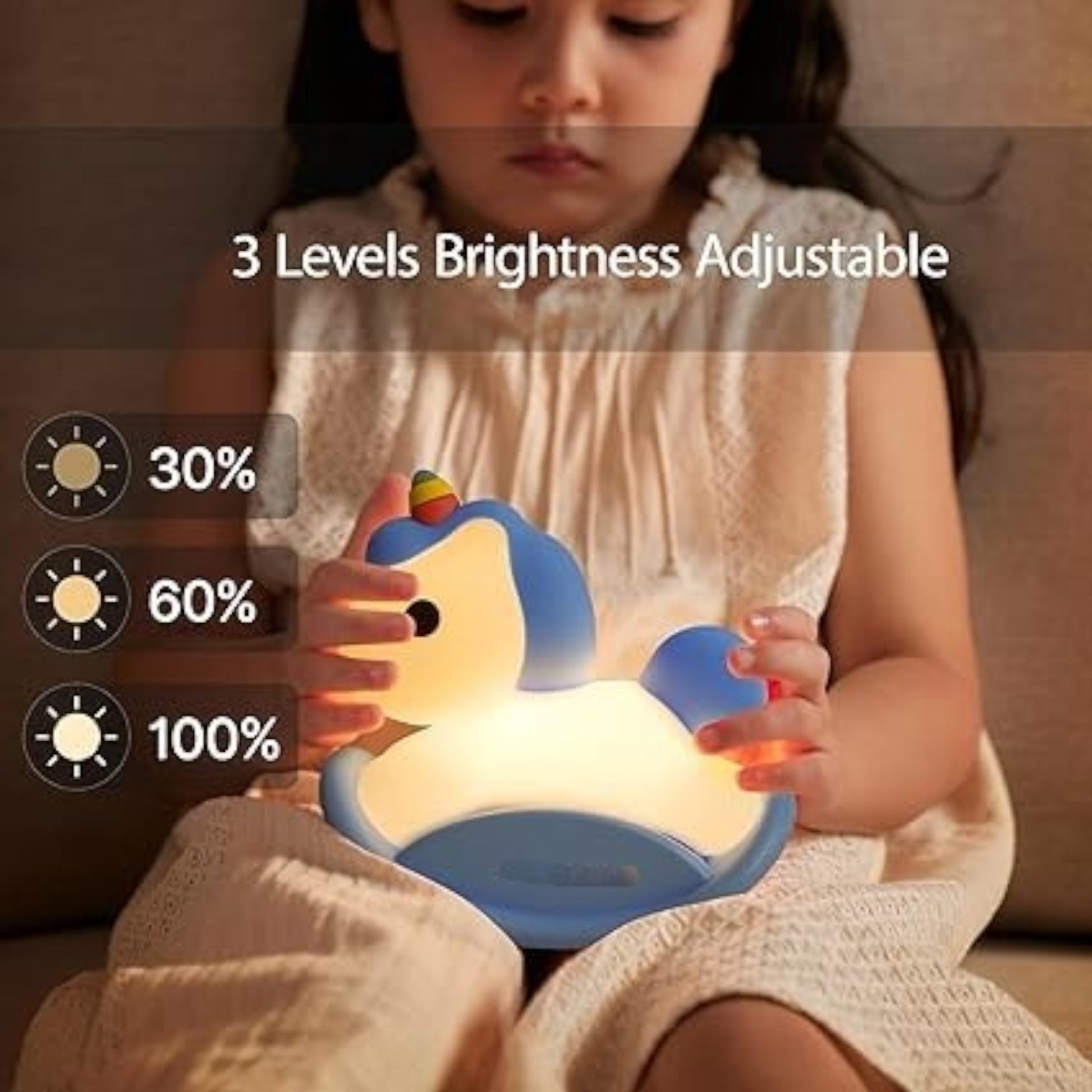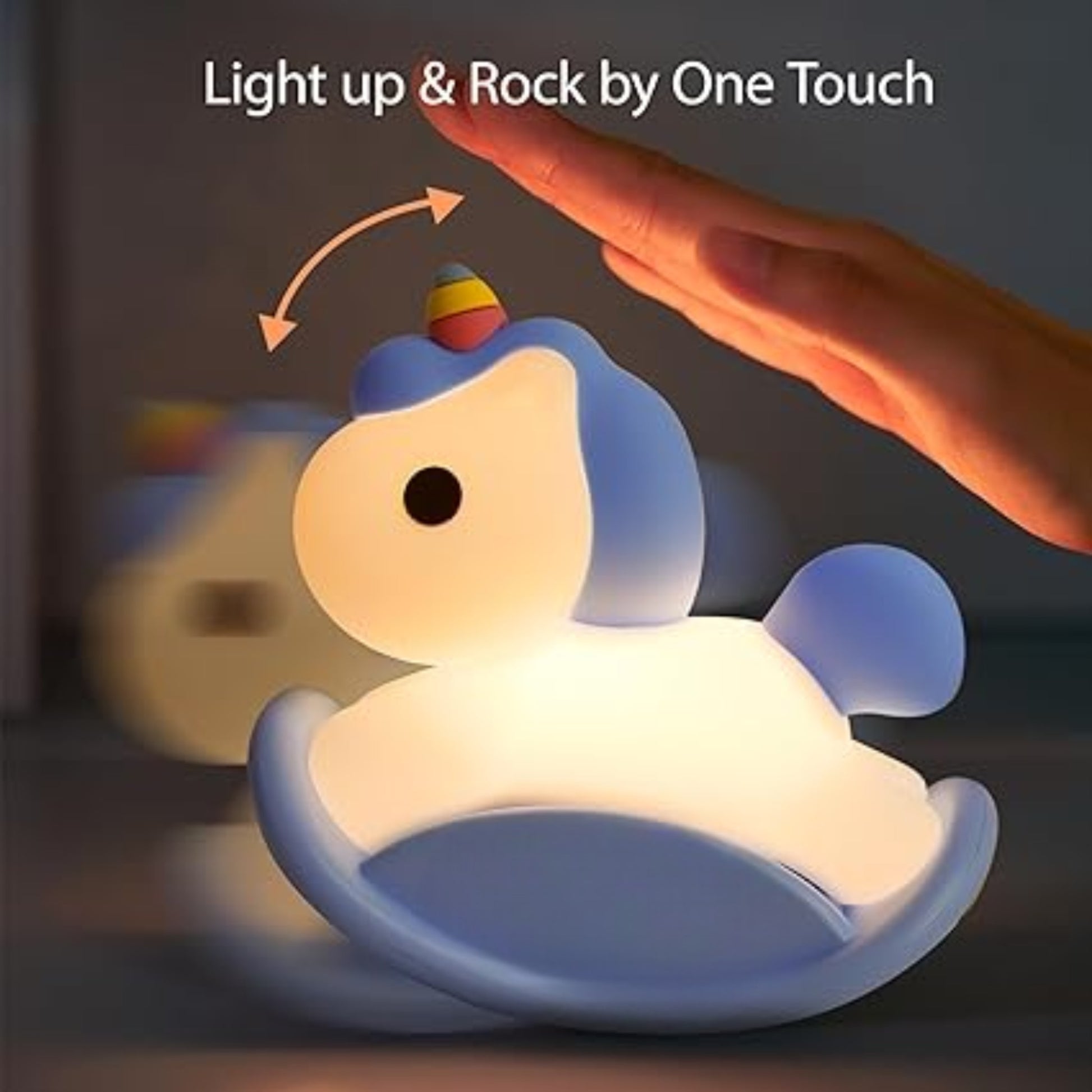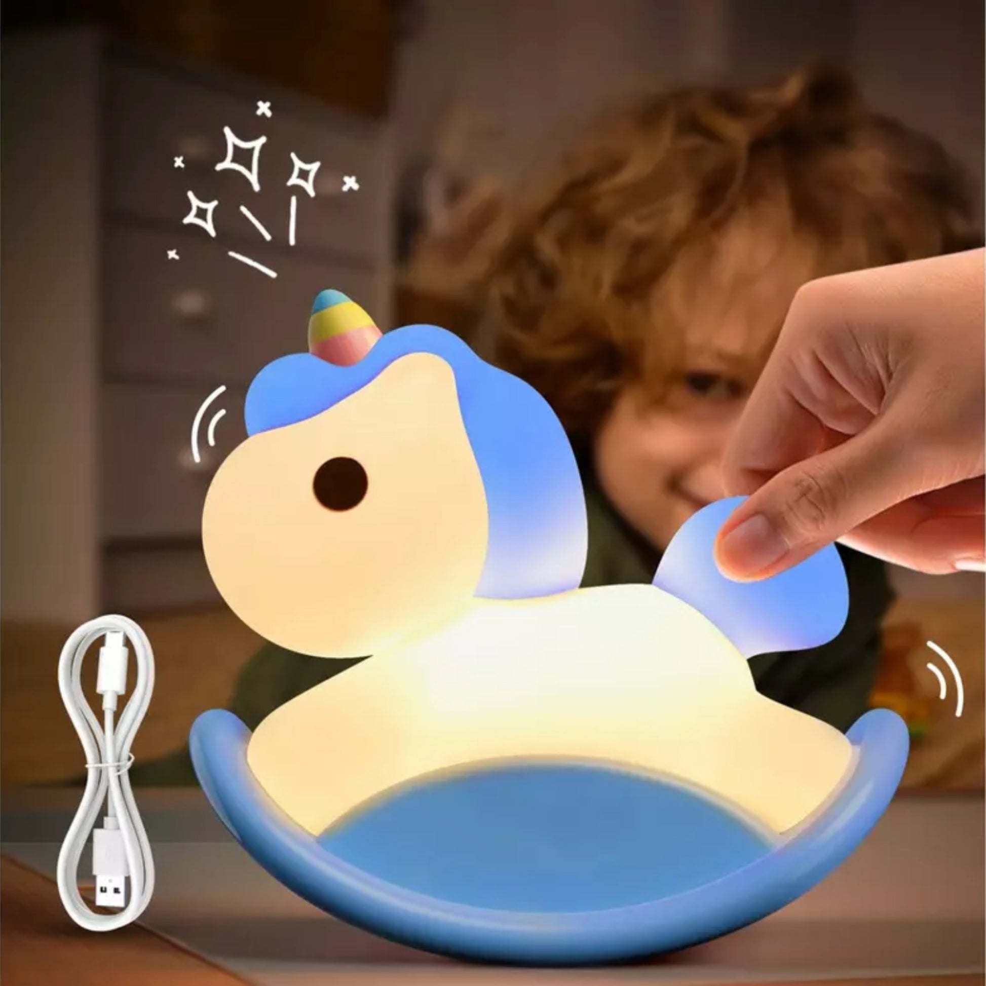 Lámpara nocturna en forma de unicornio sobre caballo mecedora, portátil y recargable por USB-C. Suave al tacto y segura para los niños, con luz cálida y niveles de brillo ajustables para crear un ambiente acogedor. Ideal para la hora de dormir, con temporizador automático y batería de larga duración. Además, su diseño encantador la convierte en un adorno divertido y reconfortante para cualquier habitación infantil.