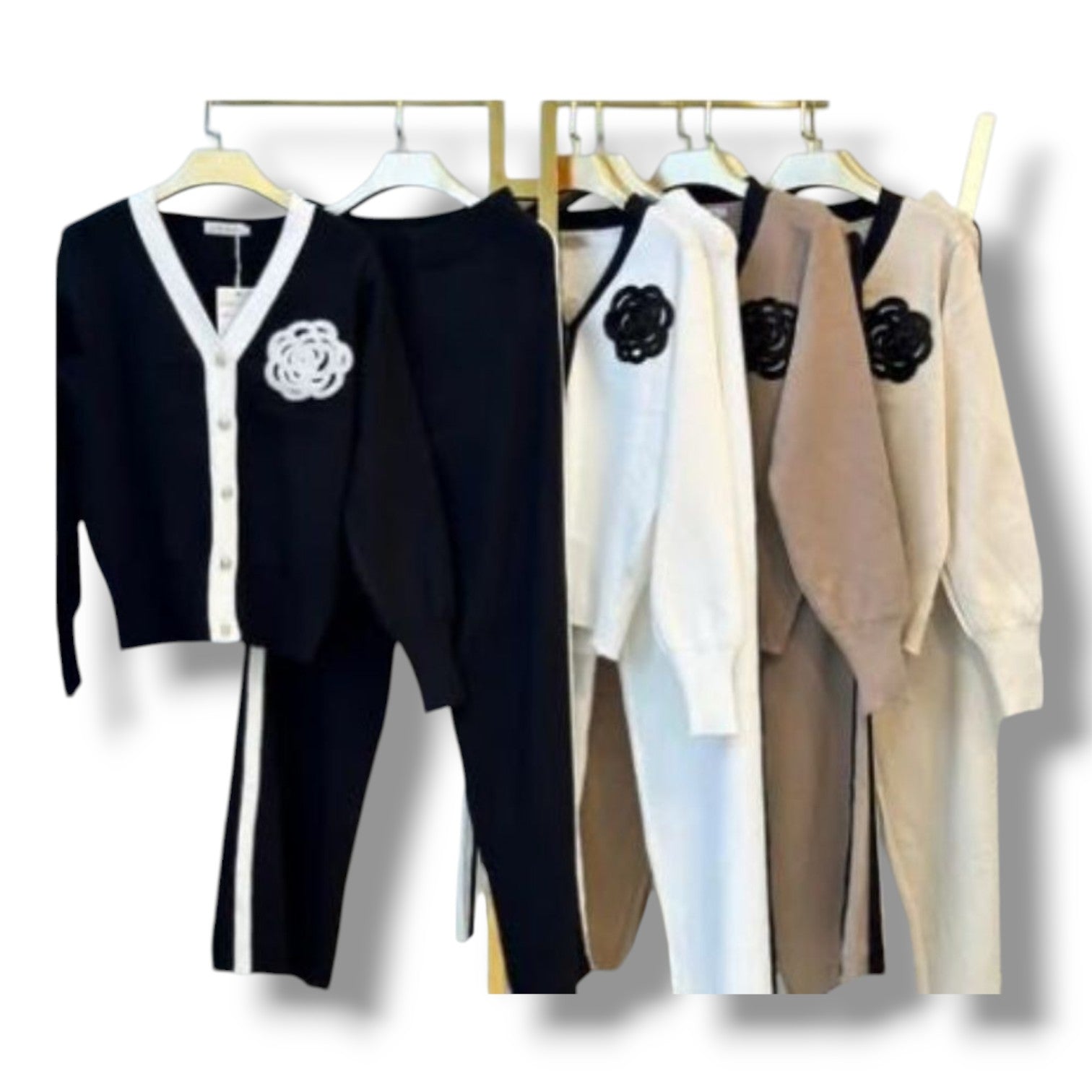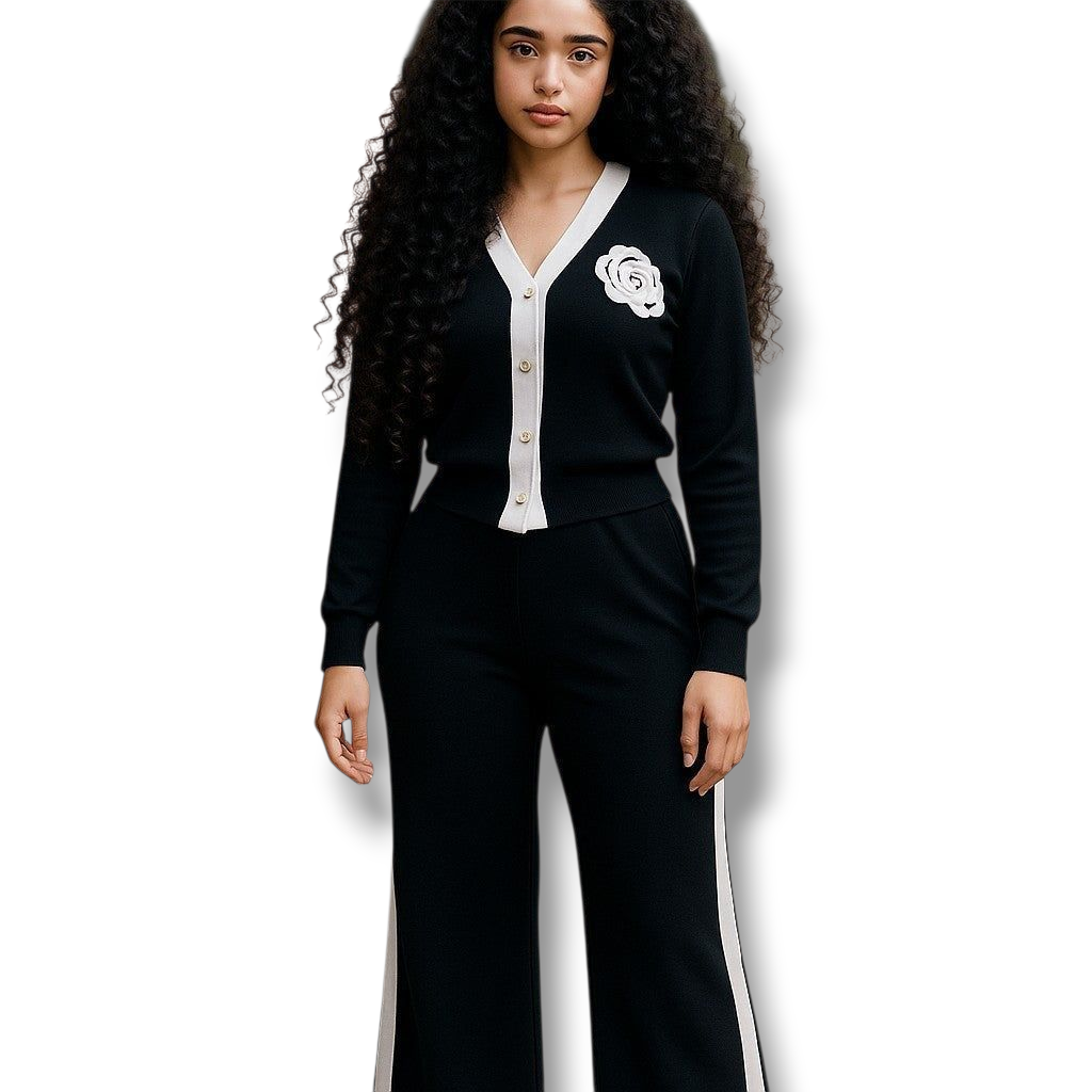 Conjunto con cárdigan y pantalón pata ancha – Detalle floral en canutillo