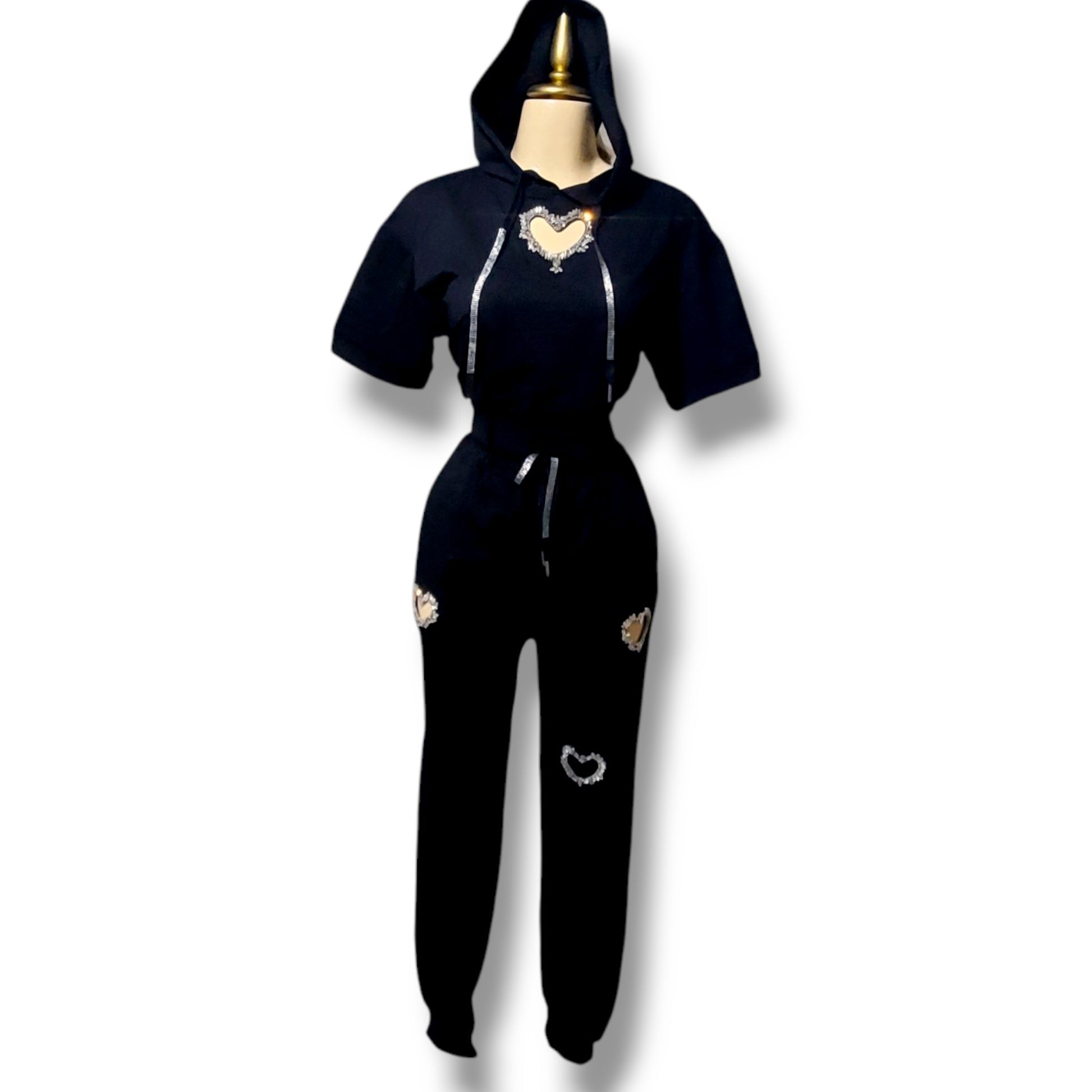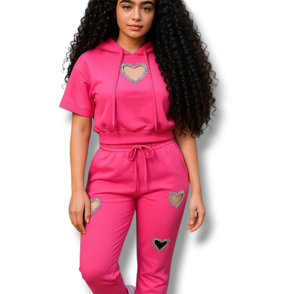 Conjunto juvenil con recortes de corazón y pedrería – Manga corta con capucha
