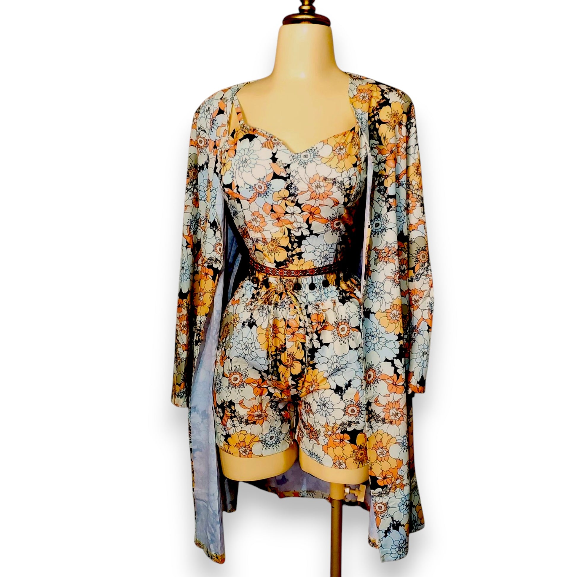 Conjunto floral de 3 piezas – Top, short y kimono a juego