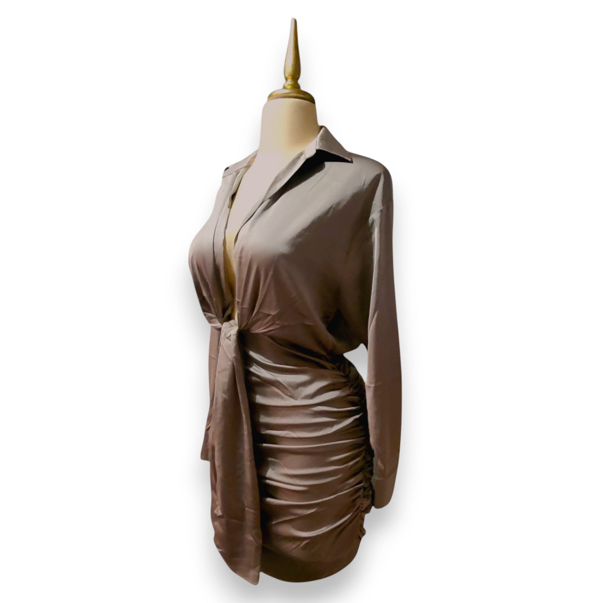 Vestido drapeado de satén con escote cruzado, que realza la figura y añade un toque elegante en la parte trasera. Perfecto para cualquier ocasión donde quieras lucir sofisticada y cómoda.