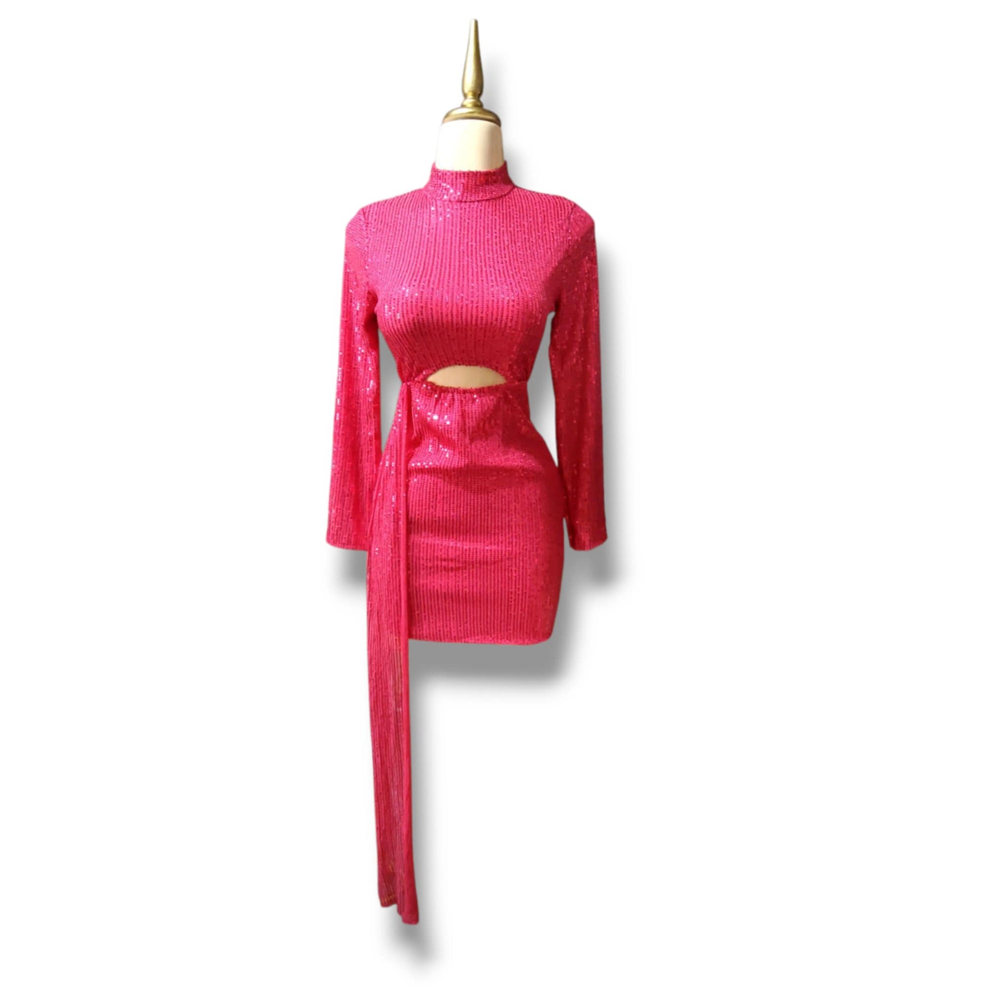 Vestido corto de fiesta con lentejuelas, manga larga y cuello alto